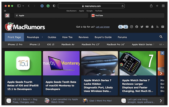 Am kommenden Montag steigt Apples diesjähriges Mac-Event. Bei dieser Gelegenheit dürfte Apple dann auch bekanntgeben, wann mit der finalen Veröffentlichung von macOS Monterey zu rechnen ist. Am gestrigen Abend wurde allerdings erstmal die zehnte Beta des kommenden Updates an die Entwickler verteilt und Apple ist nach wie vor dabei, kleinere Verfeinerungen vorzunehmen. Im Zentrum steht dabei noch immer die große Überarbeitung von Safari, dessen Neugestaltung bei den meisten Nutzern auf große Ablehnung stößt. Unter anderem hatte Apple die Lesezeichen-Symbolleiste ungewohnt unterhalb der Tableiste positioniert, was für jede Menge Kritik sorgte. In der aktuellen Beta hat Apple diesen Kurs nun revidiert und zeigt die Lesezeichen wieder oberhalb der Tabs an, wie der folgende Screenshot der Kollegen von MacRumors zeigt.
