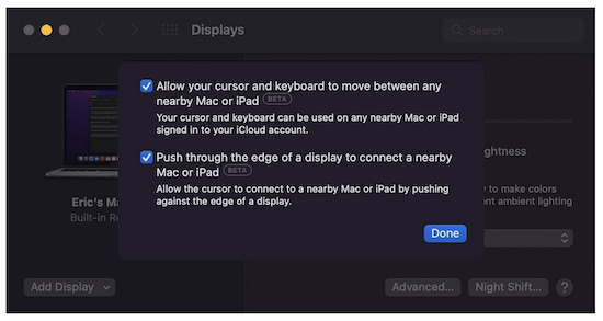 Eine weitere kleine Änderung hat Apple auch im Bereich des angekündigten "Universal Control" vorgenommen. Diese neue Funktion, mit der sich nahtlos einer oder mehrere Macs, iPads oder eine Mischung aus beidem über dieselben Eingabegeräte steuern lässt, wurde ursprünglich für macOS Monterey und iOS 15 angekündigt. Bereits früh in der Betaphase kündigte Apple aber an, dass man sie erst zu einem späteren Zeitpunkt per Update nachreichen würde. Aus diesem Grunde findet man sie auch in der zehnten Beta von Monterey nicht. Allerdings hatten findige Entwickler bereits entdeckt, dass man sie über einen Terminal-Befehl aktivieren kann. Neu ist nun, dass Apple die Funktion mit einem "Beta"-Label versieht, wenn dies geschieht. Dies könnte darauf hindeuten, dass "Universal Control" zumindest eingeschränkt zum Start von macOS Monterey und dann wohl auch einem zugehörigen iPadOS-Update zur Verfügung stehen wird. Auch hierzu liefern die Kollegen von MacRumors den passenden Screenshot.