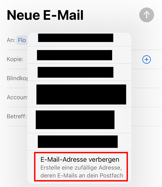 Eine weitere Neuerung im Zusammenhang mit iCloud+ auf der WWDC angekündigte Neuerung wird wohl ebenfalls mit iOS/iPadOS 15.2 ausgebaut werden. Die Rede ist von der "E-Mail Adresse verbergen" Funktion, die künftig direkt innerhalb der Mail-App aktiviert werden kann. So kann man beim Verfassen einer neuen E-Mail nun auf das "Von"-Feld tippen und anschließend "E-Mail Adresse verbergen" aktivieren, um eine zufällige Adresse als Pseudonym für die eigene Adresse eintragen zu lassen.