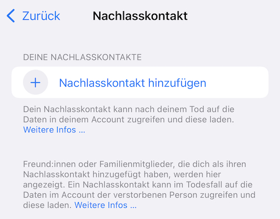 Am gestrigen Abend hat Apple die zweite Beta von iOS/iPadOS 15.2 an seine Entwickler ausgegeben und über Nacht sind verschiedene Neuerungen bekanntgeworden, die darin stecken. So hat Apple unter anderem die bereits auf der WWDC im Sommer angekündigte "Nachlasskontakt"-Funktion aktiviert. Hiermit lassen sich bestimmte Personen als berechtigt identifizieren, nach dem eigenen Tod auf das mit der Apple ID verknüpfte "digitale Erbe" zuzugreifen. Hierzu gehören unter anderem Fotos, Nachrichten, Dateien, Notizen, Kontakte, Kalendereinträge, Apps, Backuos und mehr. Kein Zugriff besteht hingegen auf Passwörter im iCloud-Schlüsselbund oder die Übertragung von Lizenzen zu digitalen Medien. Eingerichtet werden kann der Nachlasskontakt in den iCloud-Einstellungen im Bereich "Passwort & Sicherheit" und dann unter "Nachlasskontakt".