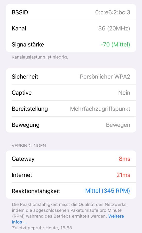 Übrigens kann man eine Auswertung der WLAN-Qualität auch auf dem iPhone durchführen. Hierzu muss man allerdings ein Konfigurationsprofil herunterladen und auf dem Gerät installieren. Wie dies geschieht, steht ebenfalls in dem angesprochenen Support Dokument.