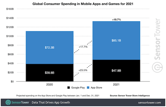 Apple hatte bereits in der vergangenen Woche seine AppStore-Jahrescharts für das sich dem Ende entgegenneigende Jahr veröffentlicht, nun legen die Analysten von Sensor Tower noch einmal mit weiteren Informationen nach. Demzufolge wächste der App-Markt auch weiterhin und es ist kein Ende in Sicht, wie die aktuellen Zahlen zeigen. Über das Jahr 2021 gaben die Nutzer in Apples AppStore und dem Google Play Store satte 133 Milliarden US-Dollar aus, was ein Zuwachs um knapp 20% gegenüber dem Vorjahr (111,1 Milliarden US-Dollar) ist. Auch weiterhin generiert der AppStore dabei trotz geringerer Nutzerzahl mehr Umsatz als der Play Store. So entfielen auf den AppStore 85,1 Milliarden, was einem Zuwachs von 17,7% gegenüber 2020 entspricht. Die restlichen 47,9 Milliarden wurden entsprechend im Play Store ausgegeben.