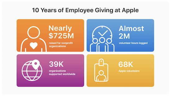 Schon seit Jahren unterstützt Apple diverse gemeinnützige Projekte und ermuntert auch seine Mitarbeiter, dies ebenfalls zu tun. Hierzu hat man vor einem Jahrzehnt das sogenannte "Giving Program" ins Leben gerufen, bei dem Apple für jeden Dollar, den ein Mitarbeiter an eine wohltätige Organisation spendet, diesen aufdoppelt und für jede freiwillige Stunde, die ein Mitarbeiter für eine solche Organisation ehrenamtlich tätig ist, diese ebenfalls mit einem monetären Betrag an dieselbe Einrichtung aufwertet. Heute hat man nun in einer Pressemitteilung bekanntgegeben, dass die Mitarbeiter bislang insgesamt knapp 725 Millionen US-Dollar gespendet und knapp 2 Millionen Sozialstunden für mehr als 39.000 unterschiedliche Organisationen geleistet haben.
