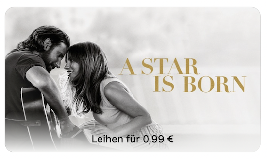 Apple hat zusätzlich zu seinem bereits liebgewonnenen "Movie Mittwoch" nun auch den "Blockbuster fürs Wochenende" ins Leben gerufen. Dabei wird jedes Wochenende ein ausgewählter Film aus dem iTunes-Sortiment für 24 Stunden zum Sonderpreis von nur € 0,99 in HD-Qualität zum Leihen angeboten. In dieser Woche handelt es sich um das oscarprämierte Drama A Star is Born mit Lady Gaga und Bradley Cooper, das man zum Sonderpreis von € 0,99 erhält. Nachdem man den Leih-Film geladen hat, kann er innerhalb von 30 Tagen angeschaut werden. Wie immer bei geliehenen Filmen aus dem iTunes Store gilt: Hat man hiermit einmal begonnen, muss man ihn innerhalb von 48 Stunden beenden.