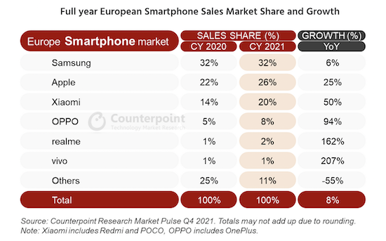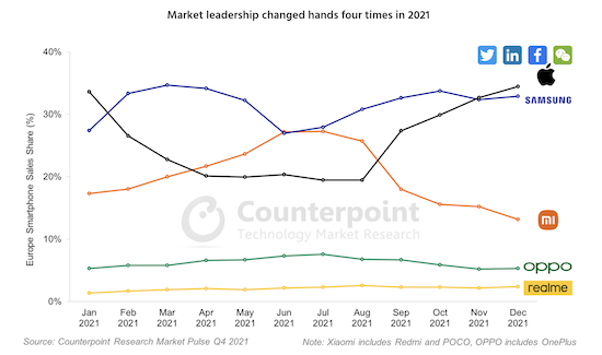 Nicht nur in China, auch in Europa konnte Apple im vergangenen Jahr kräftig Marktanteile hinzugewinnen und kommt dadurch sogar auf den besten Wert aller Zeiten in dieser Region. Den Daten der Marktbeobachter von Counterpoint Research zufolge legte Apple um satte 25% zu, was noch einmal deutlich über 8% liegt, die der Smartphone-Markt im vergangenen Jahr in Europa insgesamt wuchs. Mit einem Marktanteil von 34% konnte man, vor allem angetrieben durch das iPhone 12, dem ersten mit 5G, Anfang des Jahres den höchsten jemals in Europa gemessenen Wert erzielen. Auf das gesamte Jahr gerechnet kommt man mit einem Anteil von 26% hinter Samsung auf dem zweiten Platz ins Ziel.