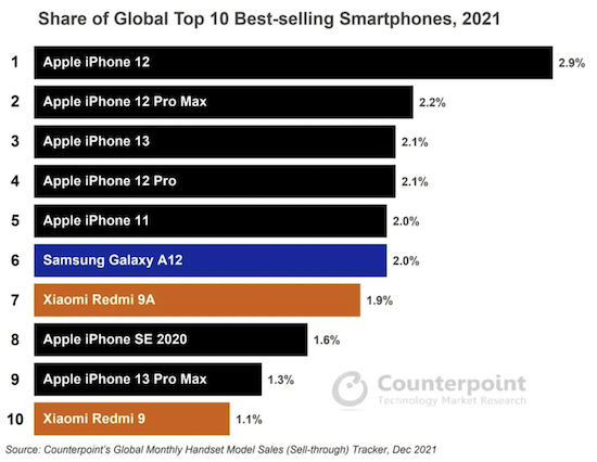 Nach wie vor trudeln die Analystenmeldungen zum Smartphone-Jahr 2021 ein. Aktuellstes Beispiel hierfür sind die Zahlen von Counterpoint, aus denen abermals hervorgeht, dass Apple ein herausragendes Jahr mit seinem iPhone hingelegt hat. In der Rangliste der meistverkauften Smartphones des Jahres finden sich gleich sieben iPhone-Modelle in den weltweiten Top 10 wieder. Die restlichen drei Plätze teilen Samsung und Xiaomi unter sich auf, wobei zwei Plätze an Xiaomi und nur einer an Samsung gehen. Insgesamt waren im vergangenen Jahr 4.200 unterschiedliche Smartphone-Modelle auf dem Markt erhältlich.