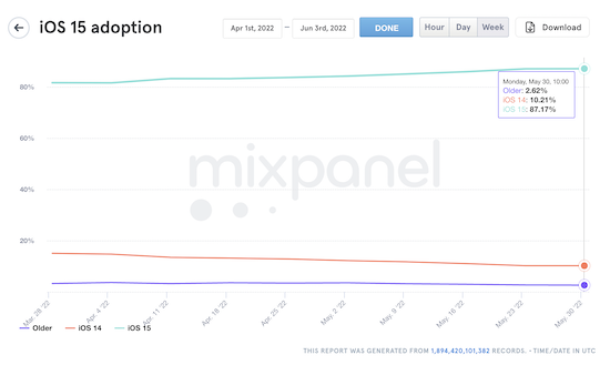 Am kommenden Montag wird Apple im Rahmen der Keynote zur Eröffnung der diesjährigen WWDC einen ersten Blick auf das im Herbst erscheinende iOS 16 gewähren. Kurz vorher werfen die AppStore-Analysten von Mixpanel jedoch noch einmal einen Blick auf den aktuellen Stand der Verbreitung von iOS 15 und stellen dabei fest, dass diese 250 Tage nach seinem Start bei inzwischen knapp 90% auf den in den vergangenen vier Jahren veröffentlichten Geräten liegt. In den letzten zehn Wochen hat die Adaption damit noch einmal um knapp 10% zugelegt. Verglichen mit iOS 14 hatte die Verbreitung von iOS 15 einen eher schleppenden Start hingelegt. Zurückgeführt wurde dies allgemein auf vergleichsweise wenige neue Funktionen und einige ärgerliche Bugs mit denen das System zu Beginn zu kämpfen hatte. Inzwischen stecken wir bereits in der Betaphase von iOS 15.6, so dass zumindest letztere so gut wie ausgemerzt sind.