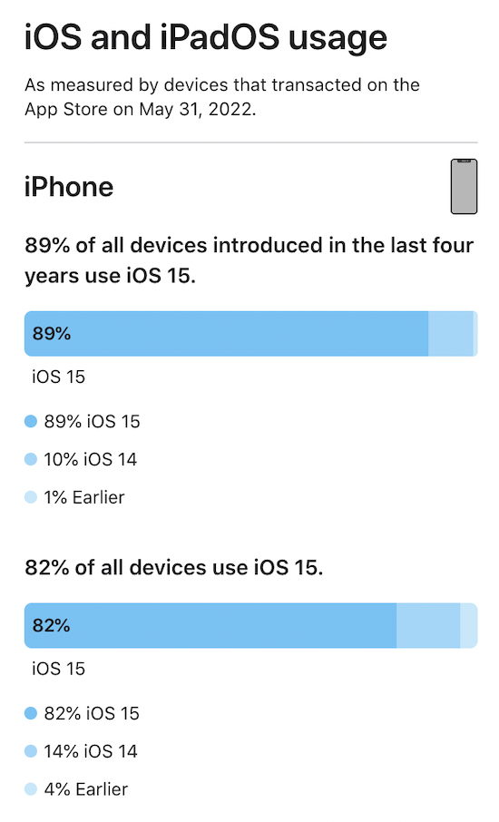 UPDATE: Inzwischen hat auch Apple mit offiziellen Zahlen nachgelegt, die die oben beschriebene Verbreitung von iOS 15 bestätigt.