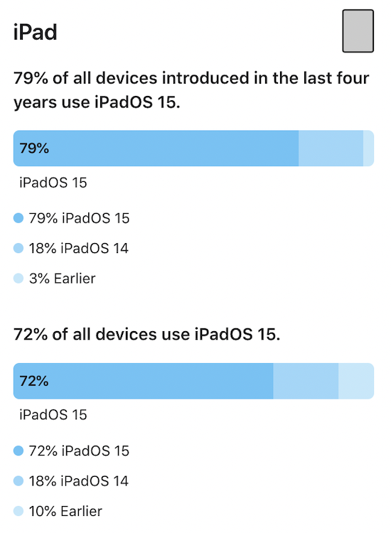 Zudem geben Apples Zahlen auch die Verbreitung von iPadOS 15 wieder. Hier ist die Verbreitung ein Stück weit weniger fortgeschritten und liegt bei knapp 80% der in den vergangenen vier Jahren vorgestellten iPads.