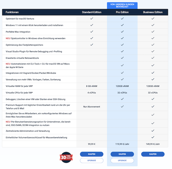 Bei der Lizenzierung hat man bei Parallels Desktop 18 die Wahl zwischen den drei Varianten "Parallels Desktop 18 für Mac", "Parallels Desktop für Mac Pro Edition" und "Parallels Desktop für Mac Business Edition". Diese lassen sich sowohl im Abonnement oder auch als Kaufversion erwerben.