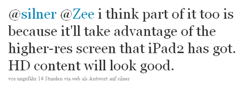 So, nun ist die Verwirrung endgültig perfekt. Als sei es nicht genug, dass in den vergangenen Tagen an allen Ecken neue und alte Gerüchte zum in Kürze erwarteten iPad 2 aus dem Boden sprießen, erfährt nun das vielleicht am meisten diskutierte Gerücht erneut eine interessante Wende. Vor Wochen begann das Rätselraten um ein Retina-Display im iPad 2. Da dies rein technisch momentan nur zu utopischen Preisen möglich wäre, wurde dieses Gerücht jedoch schon bald von einem "high-resolution" Display abgelöst, welches nicht ganz Retina-Qualität bieten, aber dennoch die Auflösung des aktuellen iPad von 1024x768 auf 2048x1536 Pixel verdoppeln (eigentlich verfierfachen) sollte. Hierfür wurden gar bereits entsprechende Grafiken in der iBooks-App gefunden. Die Rolle rückwärts folgte jedoch schon kurz darauf, als John Gruber zu Protokoll gab, keinerlei Hinweise auf eine Erhöhung der Auflösung zu besitzen und auch der Analyst Tom Mainelly hiervon erst für das iPad 3 ausgeht. Auch das inzwischen gesichtete vermeintlich Display des iPad 2 deutete entsprechendes an. Übermorgen wird nun der lang erwartete BBC-Player in den AppStore kommen, was für uns hierzulande nicht weiter bemerkenswert wäre. Die zugehörige Ankündigung durch einen der Entwickler per Twitter enthält hingegen den kleinen aber feinen Nebensatz "It'll take advantage of the higher-res screen that iPad2 has got. HD content will look good." (via TiPB) Ob diese Aussage auf Insider-Informationen oder reiner Vermutung basiert ist unklar. Fest steht aber, dass Apple in der Vergangenheit auch durchaus mit Medienunternehmen für entsprechende Apps zusammengearbeitet hat (siehe "The Daily"). Gut möglich also, dass der gute Geoff Marshall mehr weiß, als die meisten anderen. Aus meiner Sicht könnte Apple das Rätselraten so langsam mal beenden und das iPad 2 der Öffentlichkeit präsentieren...