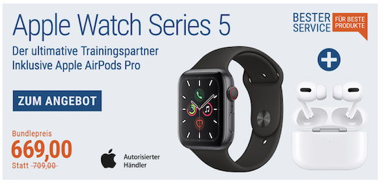 Apple Watch Series 5 und AirPods Pro im Bundle für zusammen nur € 669,-