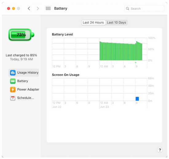 In den Einstellungen zum Akku kann man nun zudem auch eine Historie über die Akku-Nutzung einsehen. Apple stellt dabei ähnlich wie vom iPhone gewohnt dar, wie stark und durch welche Apps der Akku des MacBooks in den letzten 24 Stunden oder den letzten 10 Tagen beansprucht wurde.