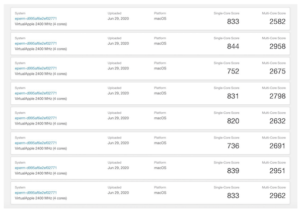 Man sollte bedenken, dass die zu sehenden Werte zum jetzigen Zeitpunkt noch nicht wirklich aussagekräftig sind. Sie bewegen sich derzeit in einem durchschnittlichen Bereich von 811 Punkten im Single-Core Modus und 2.781 Punkten im Multi-Core Modus. Die Geekbench-Ergebnisse sind vor allem auch deswegen verfälscht, da die Analyse durch Apples Emulations-Software "Rosetta 2" laufen muss. Zudem scheint Apple die Taktrate des A12Z-Chip im Mac mini des "Developer Transition Kit" auf 2,4 GHz zu begrenzen. In den aktuellen iPad Pro Modellen läuft der Chip hingegen mit 2,5 GHz. A propos iPad Pro, hier kommt der A12Z-Chip auf Geekbench-Ergebnisse von 1.118 (Single-Core) bzw. 4.625 (Multi-Core) Punkte - allerdings nativ und nicht durch Rosetta verfälscht.
