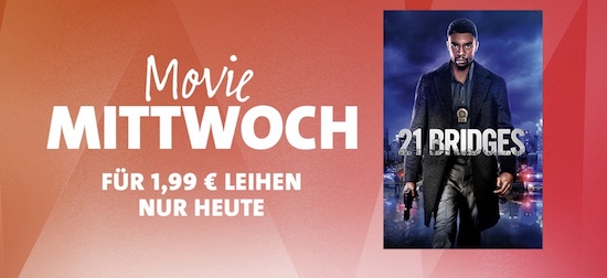 Auch heute hat Apple wieder den sogenannten "Movie Mittwoch" ausgerufen. Dabei wird jeden Mittwoch ein ausgewählter Film aus dem iTunes-Sortiment für 24 Stunden zum Sonderpreis von nur € 1,99 in 4K HDR-Qualität zum Leihen angeboten. Heute erhält man dabei sogar gleich zwei aktuelle Filme zu diesem Preis. Dabei handelt es sich einerseits um den aktuellen Thriller 21 Bridges und andererseits um den Action-Kracher Terminator - Dark Fate mit Arnold Schwarzenegger, die man beide zum Sonderpreis von € 1,99 erhält. Nachdem man den Leih-Film geladen hat, kann er innerhalb von 30 Tagen angeschaut werden. Wie immer bei geliehenen Filmen aus dem iTunes Store gilt: Hat man hiermit einmal begonnen, muss man ihn innerhalb von 48 Stunden beenden.