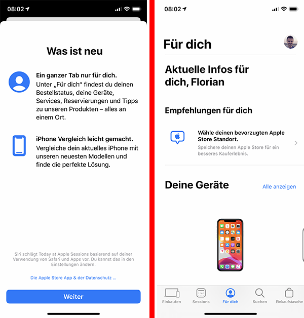 Apple hat seiner Apple Store App ein Update verpasst, welches für die Benutzerführung eine neue Option mitbringt. In Anlehnung an verschiedene andere Dienste, wie unter anderem Apple Music, findet man nun auch in der Apple Store App einen neuen Reiter mit der Beschriftung "Für dich", über den man Zugriff auf verschiedene personalisierte Informationen erhält. Hierzu gehören unter anderem der Lieferstatus von aktuellen Bestellungen, die von dem Nutzer bereits erworbenen Geräte, Empfehlungen für Zubehör, Terminreservierungen an der Genius Bar und Produktempfehlungen. Zudem kann man auf dem Tab auch Geräte vergleichen, beispielsweise ein neues iPhone, welches man beabsichtigt zu kaufen mit einem bereits bestehenden iPhone. Das Update kann ab sofort aus dem AppStore geladen werden.
