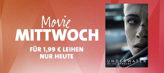 Auch heute hat Apple wieder den sogenannten "Movie Mittwoch" ausgerufen. Dabei wird jeden Mittwoch ein ausgewählter Film aus dem iTunes-Sortiment für 24 Stunden zum Sonderpreis von nur € 1,99 in 4K HDR-Qualität zum Leihen angeboten. In dieser Woche handelt es sich dabei um den aktuellen Thriller Underwater - Es ist erwacht mit Kristen Stewart, den man zum Sonderpreis von € 1,99 erhält. Nachdem man den Leih-Film geladen hat, kann er innerhalb von 30 Tagen angeschaut werden. Wie immer bei geliehenen Filmen aus dem iTunes Store gilt: Hat man hiermit einmal begonnen, muss man ihn innerhalb von 48 Stunden beenden.