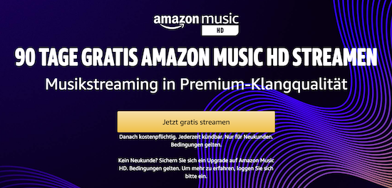 Der Online-Händler Amazon verkauft schon lange nicht mehr nur Bücher, Elektronik, Kleidung und allerlei sonstige Produkte, sondern ist auch im Bereich der digitalen Dienste höchst aktiv. Größerer Beliebtheit erfreut sich vor allem das Musikstreaming-Angebot von Amazon mit dem Namen Amazon Music HD. Dieses wird aktuell mal wieder in einem äußerst attraktiven Deal angeboten, vorausgesetzt, man hat den Dienst bislang nich nicht genutzt. Ist dies gegeben, erhält man aktuell drei Monate kostenlosen Zugriff auf Amazon Music HD. Das Angebot gilt "nur für kurze Zeit" und kann jederzeit gekündigt werden. Möchte man den Dienst anschließend weiternutzen, werden hierfür für Prime-Abonnenten monatlich € 12,99, für alle anderen € 14,99 fällig. Das Angebot kann über den folgenden Link gebucht werden: Amazon Music HD 3 Monate kostenlos