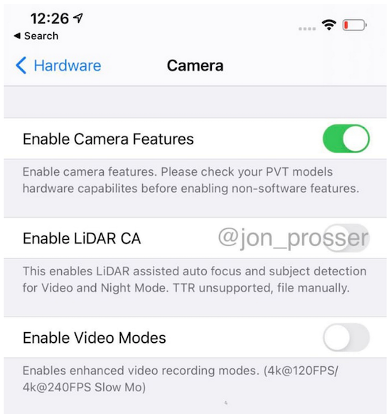 In den letzten Tagen ist es ein wenig ruhiger um den bekannten Leaker Jon Prosser geworden. Nun meldet er sich jedoch mit einem Paukenschlag zurück und veröffentlicht auf seinem Twitter-Account ein paar Screenshots, die angeblich von einem PVT-Modell (Production Validation Test) des erwarteten 6,7" iPhone 12 Pro Max stammen sollen. Darauf zu sehen sind die Einstellungen des Geräts, in denen offenbar ein Schalter existiert, mit dem sich ein LiDAR-Sensor für "assisted auto focus and subject detection for Video and Night Mode" aktivieren lässt. Zwei weitere Schalter sind mit "Enable High Refresh Rate" und "Enable Adaptive Refresh Rate" beschriftet, was darauf hindeuten könnte, dass das Gerät zudem über ein 120Hz Display verfügen wird.