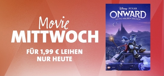 Auch heute hat Apple wieder den sogenannten "Movie Mittwoch" ausgerufen. Dabei wird jeden Mittwoch ein ausgewählter Film aus dem iTunes-Sortiment für 24 Stunden zum Sonderpreis von nur € 1,99 in HD-Qualität zum Leihen angeboten. In dieser Woche handelt es sich dabei um den aktuelle Pixar Animations-Streifen Onward: Keine halben Sachen, den man zum Sonderpreis von € 1,99 erhält. Nachdem man den Leih-Film geladen hat, kann er innerhalb von 30 Tagen angeschaut werden. Wie immer bei geliehenen Filmen aus dem iTunes Store gilt: Hat man hiermit einmal begonnen, muss man ihn innerhalb von 48 Stunden beenden.