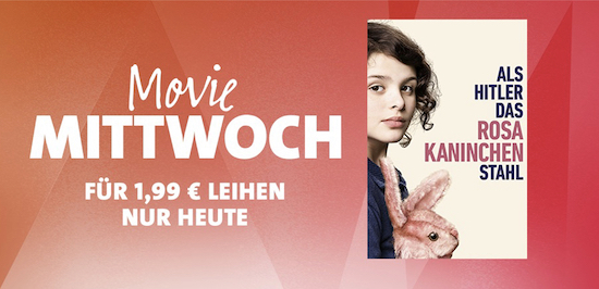 Auch heute hat Apple wieder den sogenannten "Movie Mittwoch" ausgerufen. Dabei wird jeden Mittwoch ein ausgewählter Film aus dem iTunes-Sortiment für 24 Stunden zum Sonderpreis von nur € 1,99 in 4K HDR-Qualität zum Leihen angeboten. In dieser Woche handelt es sich dabei um den aktuellen deutschen Kinder- und Familienfilm Als Hitler das rosa Kaninchen stahl, den man zum Sonderpreis von € 1,99 erhält. Nachdem man den Leih-Film geladen hat, kann er innerhalb von 30 Tagen angeschaut werden. Wie immer bei geliehenen Filmen aus dem iTunes Store gilt: Hat man hiermit einmal begonnen, muss man ihn innerhalb von 48 Stunden beenden.