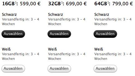 Weitere Fotos aus der Hauptstadt inklusive eines ausführlichen Berichts findet ihr bei den Kollegen von iTopnews. Heute, einen Tag nach dem internationalen Verkaufsstart kann davon ausgegangen werden, dass das Gerät deutschlandweit ausverkauft ist. Nachlieferungen dürften aber bereits in den kommenden Tagen eintreffen. Wer also doch noch zuschlagen möchte, aber die 3-4 Wochen, die der deutsche Apple Online Store momentan ausweist, nicht warten möchte, sollte sein Glück am ehesten bei einem der vier deutschen Apple Retail Stores versuchen. Einen vorherigen Anruf könnt ihr euch aber sparen. In der Regel wird dort zu Lieferungen und Liefersituation keine Auskunft gegeben.