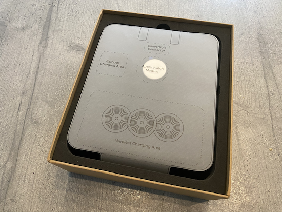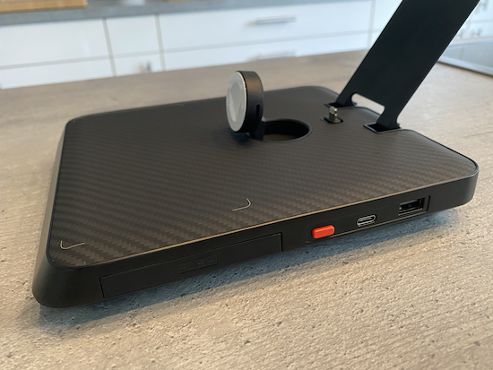 Zwar lassen sich die einzelnen kabellos zu ladenden Geräte nicht frei auf der Oberfläche platzieren, wie sich Apple dies bei seiner legendären AirPower-Ladematte vorgestellt hatte, dies stellt aber nicht wirklich ein Problem dar. Auf der Oberfläche ist deutlich zu erkennen, wo was hingehört und lässt sich dort dann auch problemlos ablegen. Für nicht kabellos zu ladende Geräte befindet sich am oberen Ende der Oberfläche ein Dock-Anschluss samt Ständer, der sich mit einer Taste von Lightning auf USB-C "umschalten" lässt und somit ein aktuelles iPad Pro oder iPad Air oder aber auch ein weiteres iPhone oder eine Apple TV Fernbedienung laden kann.