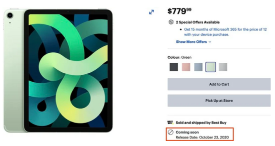 Für das iPhone 12 und das iPhone 12 Pro beginnt morgen die Vorbestellphase, ehe die ersten Geräte dann zum offiziellen Verkaufsstart am 23. Oktober auch bei den ersten Frühbestellern eintreffen dürften. Inzwischen mehren sich die Indizien dafür, dass Apple dieses Datum dann auch für den Verkaufsstart des iPad Air 4 auserkoren hat. Während man selbst auf seinen Webseiten noch von "im Oktober" spricht, listet die kanadische Webseite von Best Buy das iPad Air 4 mit einer Verfügbarkeit ab dem 23. Oktober, also dem Verkaufsstart von iPhone 12 und iPhone 12 Pro. (via MacRumors)
