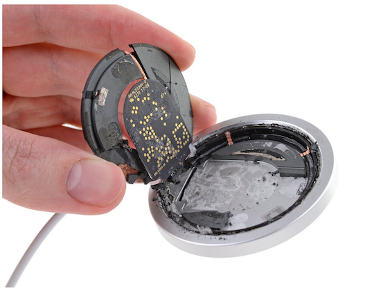 Um an das Innenleben zu gelangen, musste iFixit den Charger zerstören, da die Ober- mit der Unterseite mit einem extrem starken Klebstoff verbunden ist. Auf der Innenseite der oberen Abdeckung fanden die Spezialisten verschiedene Kupferbahnen, die die einzelnen Komponenten, wie auch das Logicboard unter der Ladespule verbinden. Im Vergleich zum ähnlich gestalteten Ladepuck der Apple Watch besteht der größte Unterschied im Aufbau vor allem in den ringförmig angeordneten Magneten, während der Puck der Watch über lediglich einen Magneten verfügt.