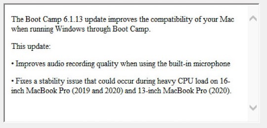 The Boot Camp 6.1.13 update improves the compatibility of your Mac when running Windows through Boot Camp.