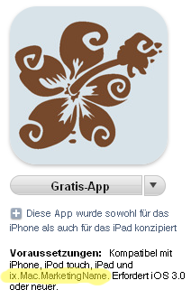 Ein Eintrag unter zahlreichen Apps im in iTunes integrierten AppStore auf dem Mac und auch der Web-Vorschau (nicht aber im mobilen AppStore) findet sich seit vergangener Nacht der Hinweis "Kompatibel mit iPhone, iPod touch, iPad und iX.Mac.MarketingName". Während sich die ersten drei Gerätebezeichnungen noch ohne Wöterbuch erschließen, handelt es sich bei "iX.Mac.MarketingName" offenbar um einen Platzhalter. Nun rätselt natürlich das ganze Internet, worum es sich hierbei handeln könnte. Das von einigen bereits vermutete iPad 2 scheidet aus, da dies mit seinem korrekten Namen beispielsweise unter der iMovie-App angezeigt wird. Andere gehen wiederum vom Apple TV aus, welches von den Grundvoraussetzungen zumindest in der Lage sein sollte, Apps wiederzugeben und um das es bereits vor einiger Zeit Spekulationen um eine AppStore-Anbindung gab. Und eine dritte Theorie orientiert sich in Richtung einer Emulationsumgebung für den Mac, um iOS-Apps auch dort nutzen zu können. Die letzte Spekulation geht in Richtung eines komplett neuen Geräts. Da es hierzu aber zumindest das eine oder andere Getuschel gegeben hätte, würde ich dies so gut wie ausschließen. Möglich ist letzten Endes auch, dass der momentan eigenständige Mac AppStore künftig in iTunes integriert wird und hierzu bereits die entsprechenden Platzhalter fehlerhaft in den Code integriert wurden. Den Spekulationen sind also Tür und Tor geöffnet.