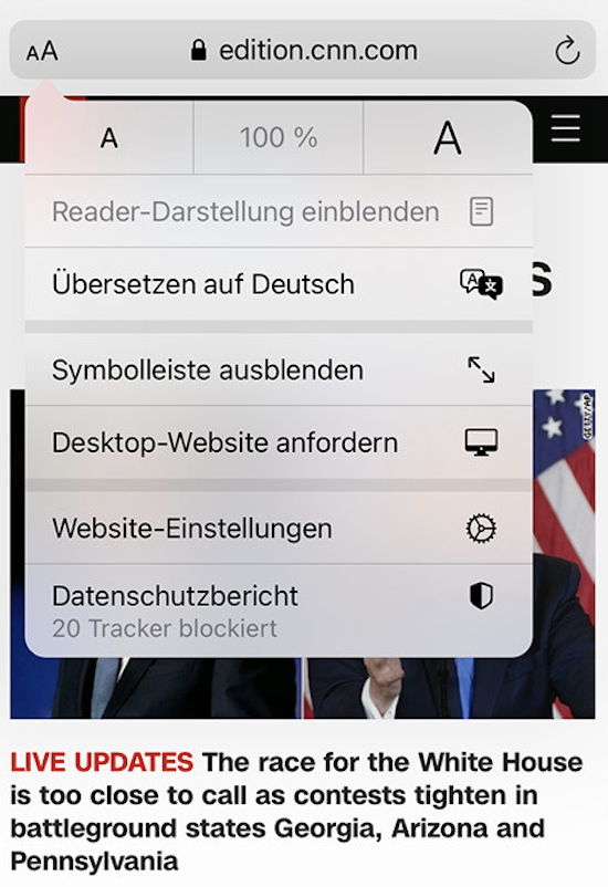 Die Übersetzung von Webseiten in fremden Sprachen erfolgt auf Basis der in den Einstellungen konfigurierten primären Sprache auf dem iPhone oder iPad. Aufgerufen werden kann die Übersetzen-Funktion in Safari indem man in der Adresszeile links auf das aA-Symbol tippt und in dem erscheinenden Menü auf "Übnersetzen auf Deutsch" tippt. Teilweise erscheint in der Adresszeile beim Aufruf einer Webseite in einer Fremdsprache auch der Hinweis "Übersetzung verfügbar". In diesem Fall kann man die Übersetzung direkt mit einem Tap auf das entsprechende Symbol auslösen. Apple weist allerdings aktuell noch darauf hin, dass sich die Übersetzen-Funktion noch im Beta-Stadium befindet.