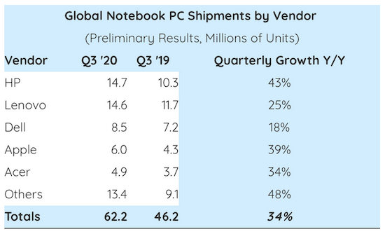 Apple bleibt auch im dritten Quartal 2020 der viertgrößte Notebook-Hersteller der Welt. Dies geht aus den aktuellen Zahlen von Strategy Analytics hervor, wonach man in diesem Zeitraum insgesamt 6 Millionen Macs an den Mann bringen konnte. Das sind 1,7 Millionen mehr als im selben Zeitraum im vergangenen Jahr, was einem Wachstum von 39% entspricht. Damit fügt sich Apple in einen insgesamt wachsenden Markt ein, der im Schnitt, wohl auch coronabedingt, um 34% zulegte. Die Spitze eroberte sich HP zurück, das erstmals in diesem Jahr vor dem Konkurrenten Lenovo landete. Dell verteidigte seinen dritten Platz, Acer vervollständigt die Top 5.