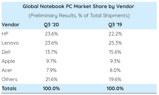 Wäre man nicht von Naschubproblemen aufgrund von coronabedingten Schließungen der Produktionsstätten in Fernost geplagt gewesen, hätten Apple und die anderen Hersteller vermutlich sogar noch mehr Geräte absetzen können. Die Nachfrage wäre wohl vorhanden gewesen und wird auch für die kommenden Monate als hoch erwartet. Insgesamt konnte Apple einen Marktanteil von knapp 10% am weltweiten Notebook-Markt für sich verbuchen.