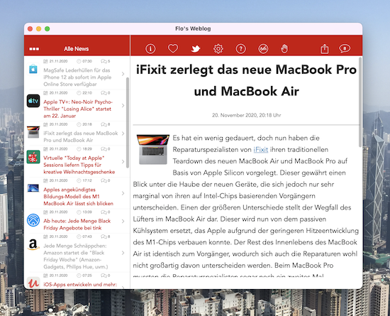 Seit macOS Big Sur ist es auf einem Apple Silicon Mac möglich, auch iOS-Apps nativ auf einem Mac auszuführen. Voraussetzung hierfür ist, dass die iOS-Entwickler dieser Option nicht aktiv widersprechen. Ob dies nun wirklich Sinn macht, muss man sicherlich für jede App separat entscheiden. Fakt ist jedoch, dass man hierdurch auch von verschiedenen Vorteilen dieser Apps profitieren kann, wie beispielsweise auch von Push Notifications, die iOS-Apps auch auf dem Mac empfangen können. Teilweise ist sogar eine durchaus ordentliche Brauchbarkeit gegeben, unter anderem überraschenderweise auch für meine App zum Blog, die sich auf dem Mac in der iPad-Variante präsentiert - und zwar ohne das ich hierfür irgendwas anpassen musste.