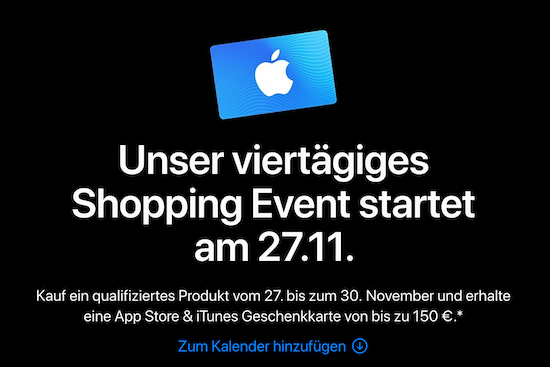 Wie jedes Jahr kündigt Apple auch für 2020 wieder ein viertägiges Shopping-Event beginnend am Black Friday und bis zum kommenden Montag, dem Cyber Monday an und weckt damit leise Hoffnung, dass man in diesem Jahr vielleicht mit etwas interessanteren Deals als in den vergangenen Jahren rechnen könnte. Im Endeffekt setzt man allerdings auch dieses Jahr "lediglich" die Tradition der letzten Black Fridays fort und gibt beim Kauf eines qualifizierten Produkts eine Geschenkkarte als kostenlose Dreingabe dazu. Ausgenommen sind dabei die meisten der aktuellsten Produkte, wie beispielsweise die iPhone 12 Modelle oder die neuen Apple Silicon Macs.