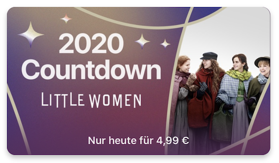 Das Weihnachtsfest rückt mal wieder näher und während sich bei manchen Freude und Besinnlichkeit breit macht, kommt bei anderen eher Hektik beim Weihnachtsshopping auf. Vor allem für Kinder bedeutet die Zeit bis zum Weihnachtsfest jeden Tag ein bisschen Freude beim Öffnen der Türen des Adventskalenders. Auch Apple bietet in diesem Jahr wieder eine Dezember-Aktion an und weitet diese gar auf 31 Tage, also bis zum Ende des Monats aus. Unter dem Motto "2020 Countdown" wird man dabei jeden Tag mit einem neuen Inhalt aus dem Film-Bereich des iTunes Store zum Sonderpreis beschenkt. Heute erhält man auf diese Weise das Drama Little Women mit Emma Watson für nur € 4,99 zu kaufen.