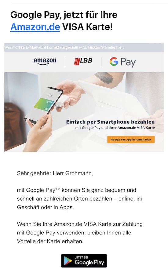 Wie Amazon inzwischen seine Nutzer informiert, unterstützt die von der Landesbank Berlin AG ausgegebene VISA-Karte des Internet-Versandhändlers inzwischen auch Google Pay (mit Dank an Richard!). Der Schritt auch hin zu Apple Pay dürfte damit nun hoffentlich auch nicht mehr fern sein. Ein konkreter Termin steht allerdings auch weiterhin aus.