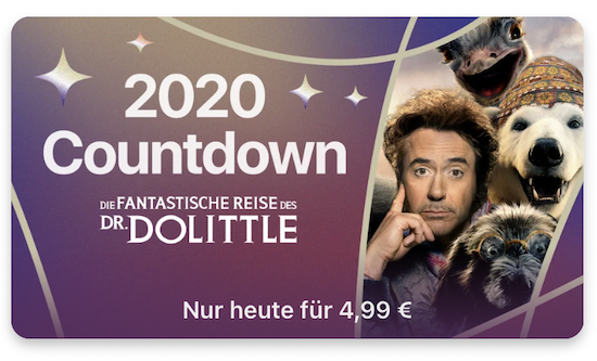 Das Weihnachtsfest rückt mal wieder näher und während sich bei manchen Freude und Besinnlichkeit breit macht, kommt bei anderen eher Hektik beim Weihnachtsshopping auf. Vor allem für Kinder bedeutet die Zeit bis zum Weihnachtsfest jeden Tag ein bisschen Freude beim Öffnen der Türen des Adventskalenders. Auch Apple bietet in diesem Jahr wieder eine Dezember-Aktion an und weitet diese gar auf 31 Tage, also bis zum Ende des Monats aus. Unter dem Motto "2020 Countdown" wird man dabei jeden Tag mit einem neuen Inhalt aus dem Film-Bereich des iTunes Store zum Sonderpreis beschenkt. Heute erhält man auf diese Weise die Komödie Die fantastische Reise des Dr. Dolittle mit Robert Downey Jr. für nur € 4,99 zu kaufen.