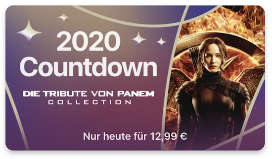 Das Weihnachtsfest ist inzwischen da und vor allem für Kinder bedeutete die Zeit bis zum Weihnachtsfest jeden Tag ein bisschen Freude beim Öffnen der Türen des Adventskalenders. Auch Apple bietet in diesem Jahr wieder eine Dezember-Aktion an und weitet diese gar auf 31 Tage, also bis zum Ende des Monats aus. Unter dem Motto "2020 Countdown" wird man dabei jeden Tag mit einem neuen Inhalt aus dem Film-Bereich des iTunes Store zum Sonderpreis beschenkt. Heute erhält man auf diese Weise das Film-Bundle Die Tribute von Panem - Complete Collection, bestehend aus allen vier Filmen der Reihe für nur € 12,99 zu kaufen.