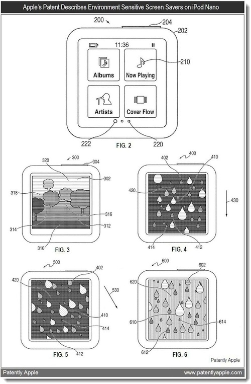Die Gerüchte zum vermutlich im September kommenden nächsten iPod nano nehmen erstaunlich früh Fahrt auf. Nachdem aus Fernost bereits zweimal Fotos eines nano-Gehäuses mit einer Aussparung für eine (Video-)Kamera aufgetaucht sind (hier und hier), befeuert nun auch ein Apple-Patent die Gerüchte um eine Rückkehr der Kamera in den nano, wie die Patentspezialisten von Patently Apple herausgefunden haben. Hierin ist deutlich die Rede von einer Kamera in besagtem Gerät. Doch nicht nur das. Der nano könnte dem Patent zufolge künftig auch über Umgebungssensoren verfügen, die dann unter anderem dafür genutzt werden könnten, um auf dem Display einen an die jeweilige Umgebung angepassten Bildschirmschoner laufen zu lassen. Als einer dieser Umgebungssensoren könnte dabei dann auch die Kamera dienen. Zudem könnten Dinge wie Bewegungen, Geräusche und die aktuelle Temperatur ermittelt werden. Dem Patent zufolge könnte auch die Geräteausrichtung ermittelt werden, so dass die abgebildeten Regentropfen immer nach unten fallen. Auf einer der Konzeptzeichnungen des Homescreens ist darüber hinaus auch eine Referenz für Spiele zu sehen. Hierbei könnte es sich allerdings auch um einen bloßen Platzhalter handeln. Der Antrag stammt übrigens interessanter Weise aus dem November 2009, wurde also ziemlich genau ein Jahr vor der Vorstellung des aktuellen iPod nano Formfaktors eingereicht. (via MacRumors)