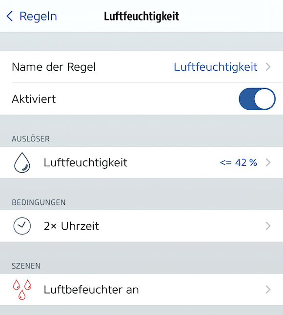 Grundlage für die Automatisierung ist selbstverständlich ein Sensor, der die Luftfeuchtigkeit im Raum misst. Hierzu kommt bei mir die HomeKit-fähige Netatmo-Wetterstation (€ 151,50 bei Amazon) zum Einsatz, die nicht nur die Temperatur drinnen und draußen messen kann, sondern auch die Luftqualität, Lärmbelastung und eben die Luftfeuchtigkeit in den heimischen vier Wänden. Auf Basis dieser Information lässt sich dann eine Automation erstellen, die bei Unterschreiten eines auszuwählenden Schwellwertes einen Luftbefeuchter ins Spiel bringt.