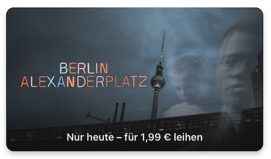 Auch heute hat Apple wieder den sogenannten "Movie Mittwoch" ausgerufen. Dabei wird jeden Mittwoch ein ausgewählter Film aus dem iTunes-Sortiment für 24 Stunden zum Sonderpreis von nur € 1,99 in HD-Qualität zum Leihen angeboten. In dieser Woche handelt es sich dabei um das deutsche Drama Berlin Alexanderplatz den man zum Sonderpreis von € 1,99 erhält. Nachdem man den Leih-Film geladen hat, kann er innerhalb von 30 Tagen angeschaut werden. Wie immer bei geliehenen Filmen aus dem iTunes Store gilt: Hat man hiermit einmal begonnen, muss man ihn innerhalb von 48 Stunden beenden.