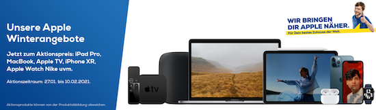 Zwar läuft aktuell keine der weltweiten großen Shopping-Aktionen, dennoch kann man dieser Tage bei EURONICS teils kräftig beim Kauf von Apple Produkten sparen. Dort hat man nämlich ab sofort und noch bis zum 10. Februar die "Apple Winterkampagne 2021" ausgerufen, in deren Rahmen sich verschiedene Produkte aus sämtlichen Bereichen reduziert erwerben lassen. Achtet aber auf die jeweils angezeigten Preise, es sind nämlich nicht alle Apple-Produkte von der Aktion betroffen. Stöbert bei Interesse am besten einfach mal durch. der folgende Link führt direkt zur Landing-Page der Aktion bei EURONICS: Apple Winterkampagne 2021