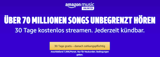 Der Online-Händler Amazon verkauft schon lange nicht mehr nur Bücher, Elektronik, Kleidung und allerlei sonstige Produkte, sondern ist auch im Bereich der digitalen Dienste höchst aktiv. Größerer Beliebtheit erfreut sich vor allem das Musikstreaming-Angebot von Amazon mit dem Namen Amazon Music Unlimited. Dieses wird aktuell mal wieder in einem äußerst attraktiven Deal angeboten, vorausgesetzt, man hat den Dienst bislang nich nicht genutzt. Ist dies gegeben, erhält man aktuell 30 Tage Zugriff auf Amazon Music Unlimited für umme. Das Angebot kann jederzeit gekündigt werden. Möchte man den Dienst anschließend weiternutzen, werden hierfür für Prime-Abonnenten monatlich € 7,99, für alle anderen € 9,99 fällig. Das Angebot kann über den folgenden Link gebucht werden: Amazon Music Unlimited 30 Tage kostenlos