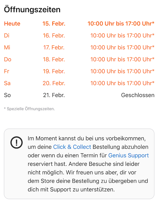 Ab heute steht zudem auch wieder die Möglichkeit zur Verfügung, einen Apple Store zum Zwecke eines Support- oder Reparaturtermins an der Genius Bar zu besuchen. Hierzu hat Apple spezielle Öffnungszeiten in den Stores eingerichtet, die allerdings, ebenso übrigens wie auch eine "Click & Collect" Abholung einen zuvor vereinbarten Termin voraussetzt.