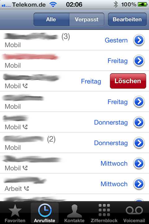 Neben den großen und von Apple angepriesenen Neuigkeiten in iOS 5 finden sich bei solchen Updates auch immer kleine, aber umso feinere Änderungen und Neuerungen, die einem das Leben erleichtern. Auch in iOS 5 finden sich wieder solche kleinen Schätze. Für viele iPhone-User ganz oben auf der Liste stand schon lange der Wunsch, auch einzelne Telefonate aus der Anrufliste löschen zu können. Bisher konnte man nur die komplette Liste leeren. Mit iOS 5 wird nun endlich auch das gezielte Löschen möglich sein! Per bekannter seitlicher Swipe-Geste ruft man den gewohnten Löschen-Button auf und kann auf diese Weise den Eintrag aus der Liste entfernen. Was Apple so lange von der Umsetzung dieses Wunsches abgehalten hat, wird wohl für immer ein Geheimnis bleiben.