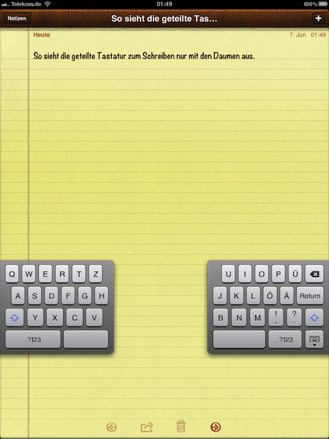 Auch für die Vielschreiber unter den iOS-Usern ist etwas Nettes mit an Bord. Die geteilte Tastatur für das vereinfachte Schreiben hat Apple bereits auf der Keynote angekündigt. Dies sieht in der Praxis dann folgendermaßen aus: