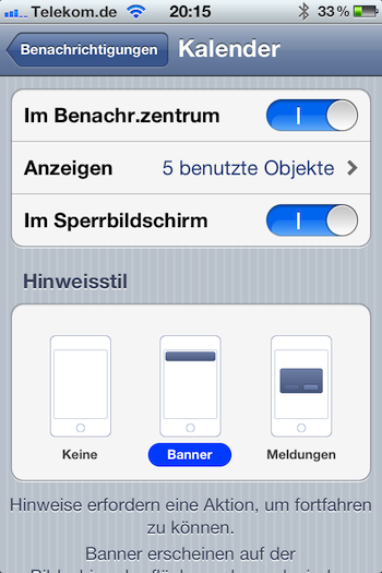 Augenscheinlichste Neuerung ist sicherlich das Notification Center und die nun dezenter eingeblendeten Benachrichtigungen. Speziell letzte wirken nun deutlich eleganter und zeitgemäßer als ihre blauen Pop-up Vorgänger. Wenngleich diese nich vollends aus dem iOS verbannt werden. In den Einstellungen kann man künftig nämlich für jede App gesondert festlegen, wie und ob sie bei einer Benachrichtigung auf sich aufmerksam machen soll.