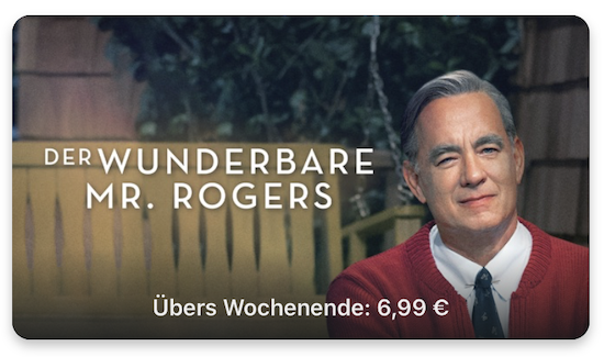 Darüber hinaus lässt sich das herzerwärmende Drama Der wunderbare Mr. Rogers mit Tom Hanks in der Hauptrolle nur über das Wochenende zum Preis von € 6,99 käuflich im iTunes Store erwerben. Einmal gekaufte Filme lassen sich jederzeit erneut aus dem iTunes Store herunterladen und sind auf allen verbundenen Geräten uneingeschränkt nutzbar.